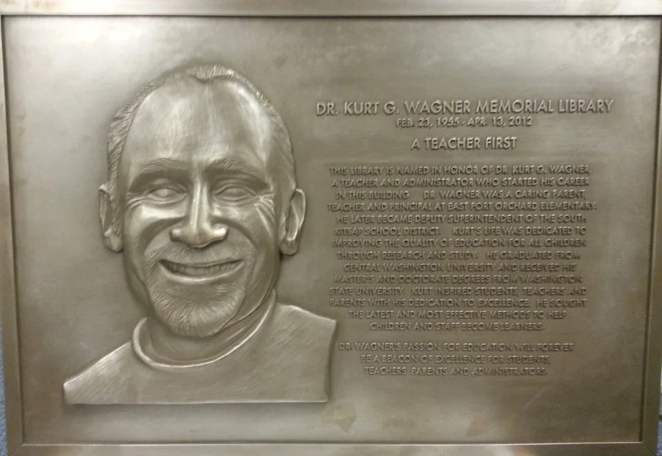 This Memorial is located at the East Port Orchard Elementary school library in Kitsap County Washington. Dr. Kurt Wagner was a wonderful man who will be missed. I sculpted the bas relief from clay.